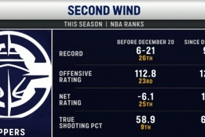 快船主场迎战黄蜂,转播方对比了快船前27场和近11场各项数据对比。