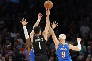 体育资讯1月5日讯 NBA常规赛,太阳在主场以108-105击败雷霆。比赛最后时刻,布克不讲理三分绝杀。